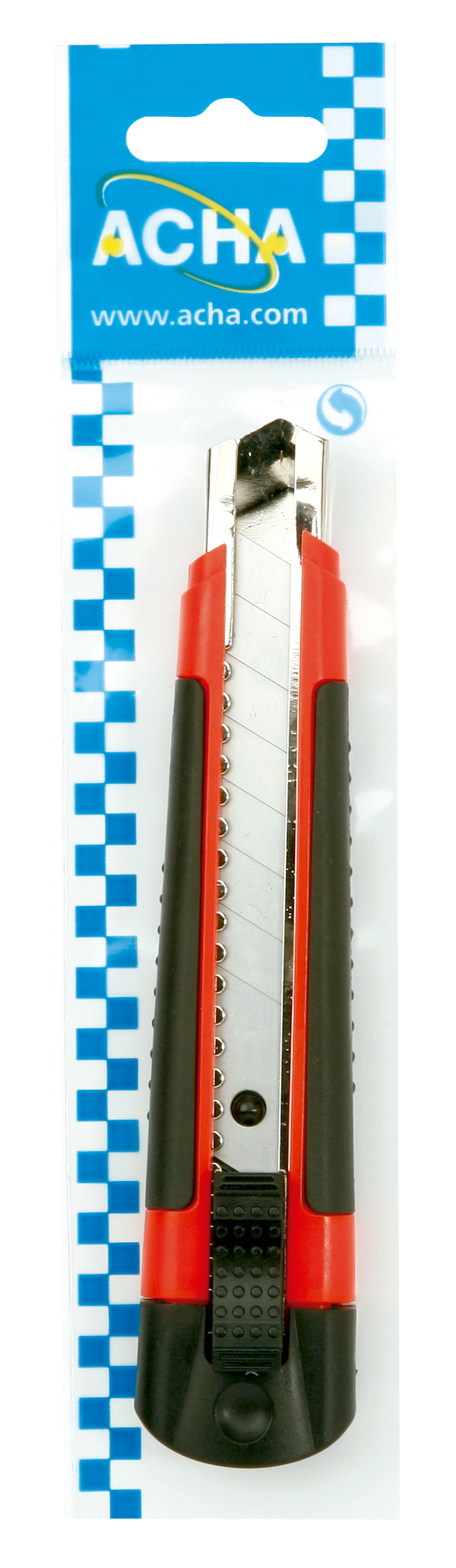 Cutter con guía metálica inoxidable con hoja de 18 mm. “Recto Neo” mango bicomponente. Bloqueo automático