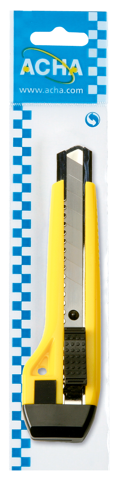 Cutter con guía metálica inoxidable con hoja de 18 mm. Mango de plástico. Bloqueo automático