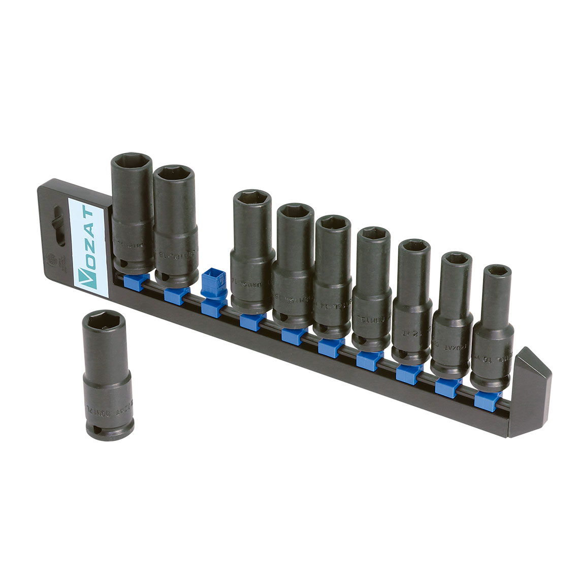 • Juegos de 10 vasos de impacto de 1/2” largos en regleta de plástico (métrica)