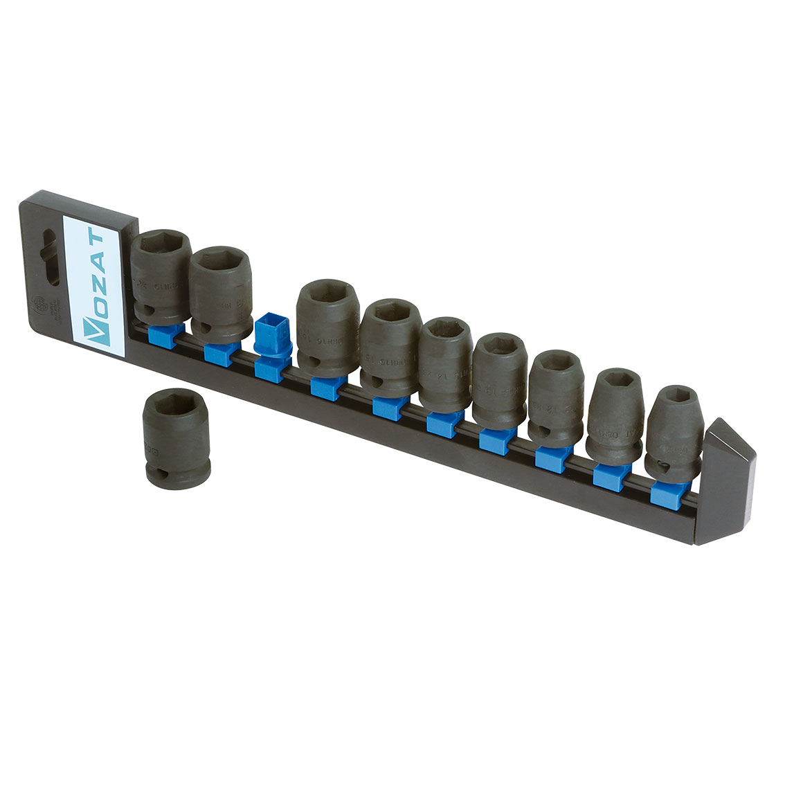 • Juegos de 10 vasos de impacto de 1/2” en regleta de plástico (métrica)