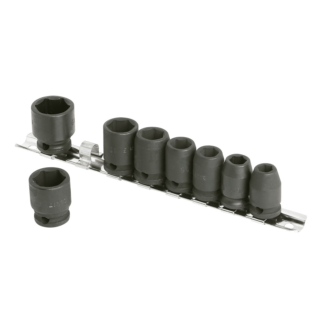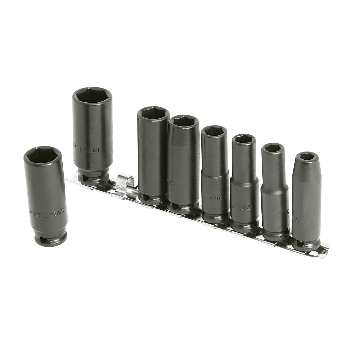 • Juegos de vasos de impacto de 3/8” largos en regleta de plástico
